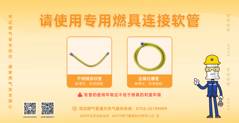 根据国标《燃气工程项目规范》GB55009-2021第6.1.7条款规定:当家庭用户管道或液化石油气钢瓶调压器与燃具采用软管连接时,应采用专用燃具连接软管。软管的使用年限不应低于燃具的判废年限。